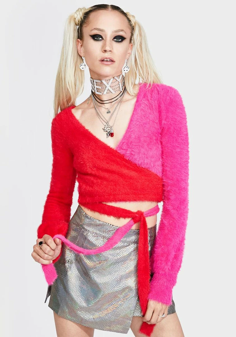 cuz it’s your life, weΓ’ΒΒre just living in it! This sassy crop sweater has a supa fuzzy knit construction, a split colorblock design, and an adjustable wrap tie closure.