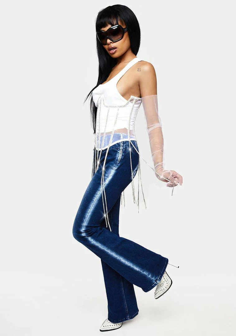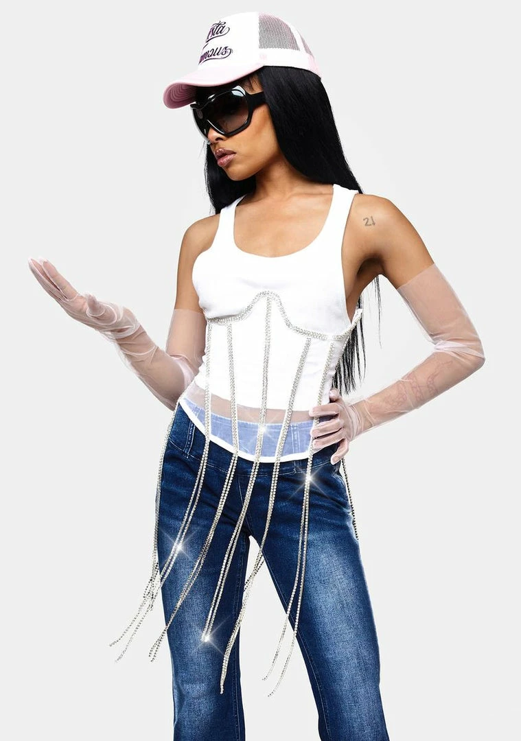 cuz you’re extra and we love it. This underbust corset top is made from sheer mesh with structured boning details, crystal trim with dangling fringe, and lace up closures at the back.