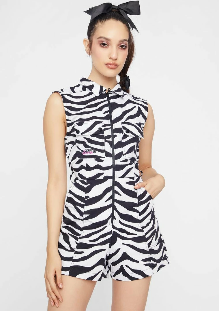cuz you let it roar. This playsuit has a zipper closure, collar and zebra print.