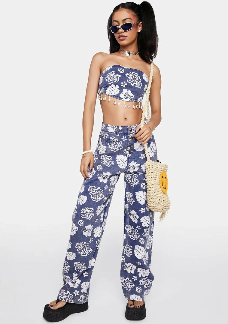 cuz let’s have some fun in the sun! This top has a cotton twill construction, an allover tropical floral print, a curved hem, puka shell fringe, an elastic band in the back, a cropped fit, and a side zipper closure.