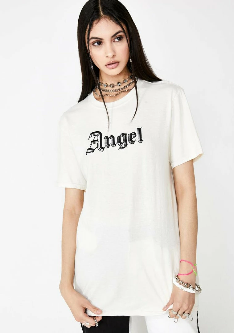 liesssss! Play innocent AF in this dope short sleeve graphic tee that has a crew neckline, sikk ANGEL script across the front N’ a loose fit.