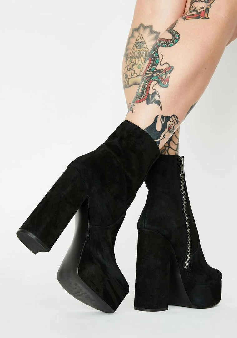 cuz ya never go unnoticed, hun. Make a scene in these bad bish platform booties that have a suede leather construction with chunky block heels and side zip closures.