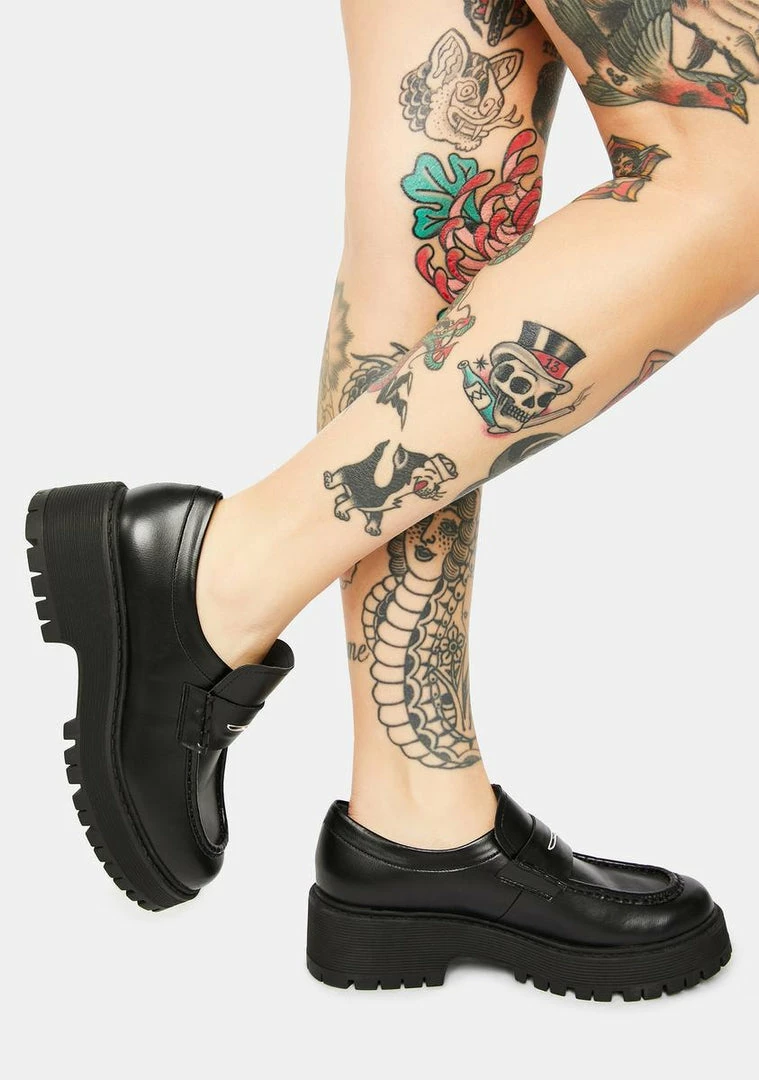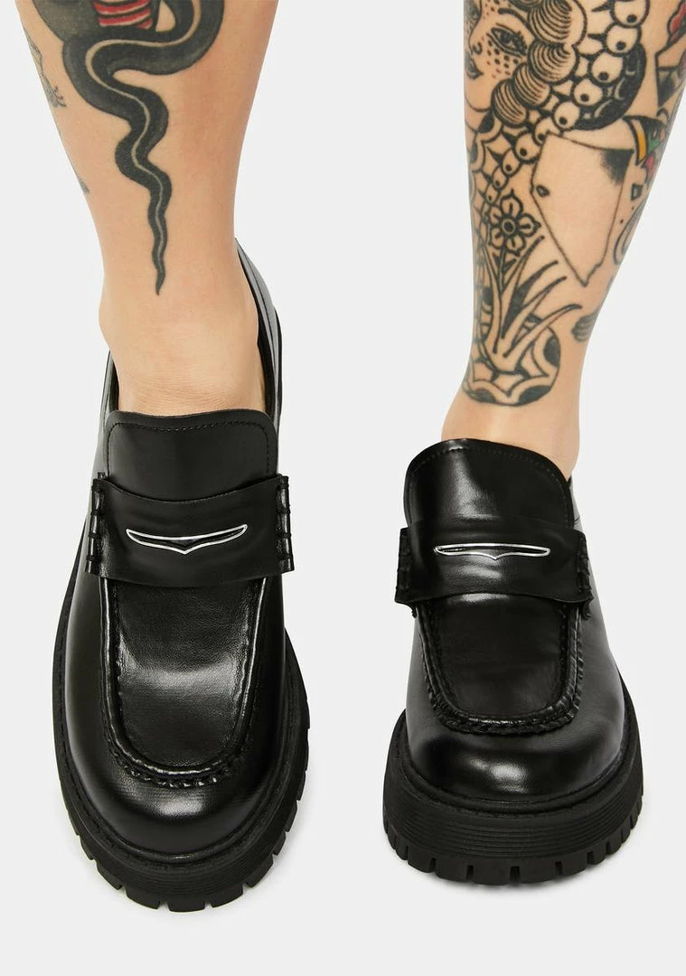 cuz you got that rock and roll vibe. These chunky patent leather loafers have a slip-on fit and platform soles.