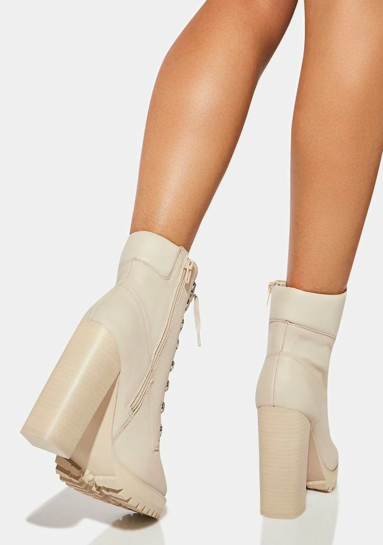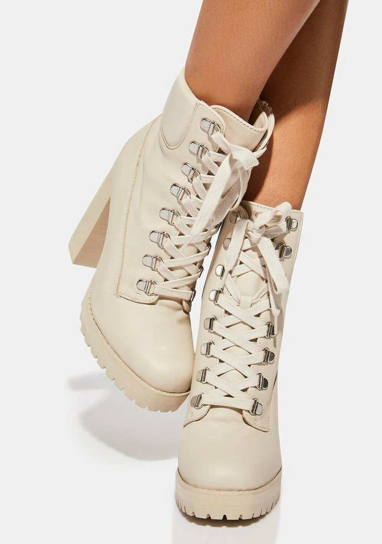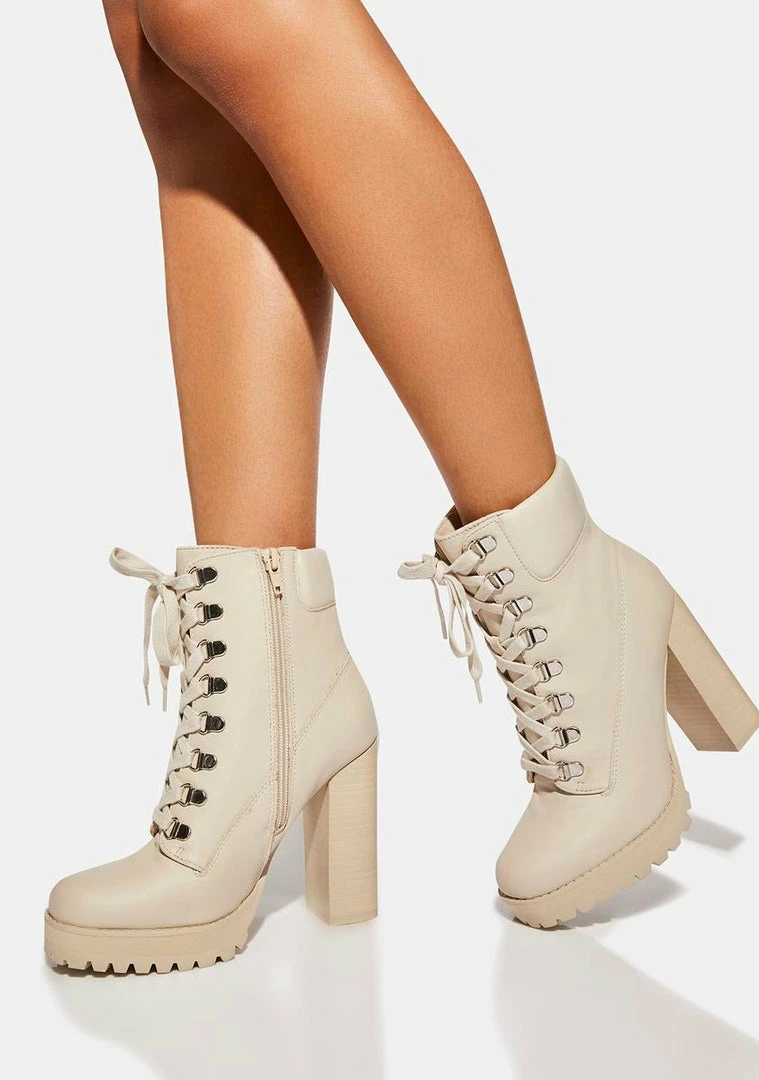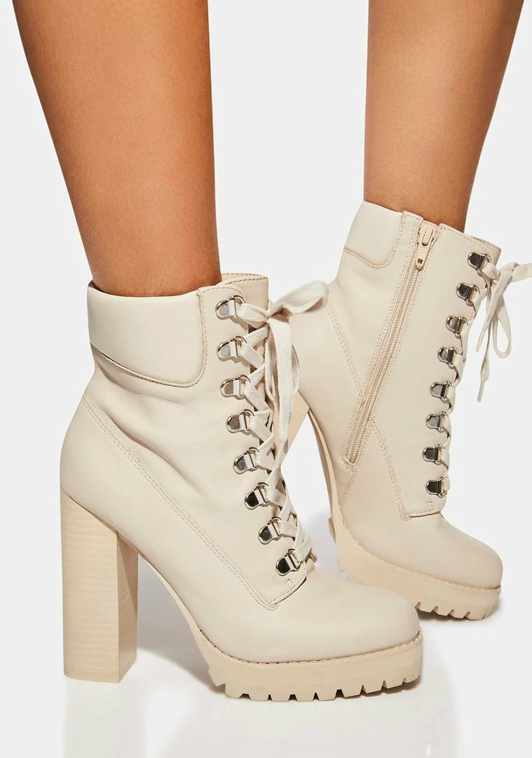 cuz you don’t kiss and tell. These vegan leather boots have a treaded platform, wood look heel, lace up front with metal details, and a side zip closure.