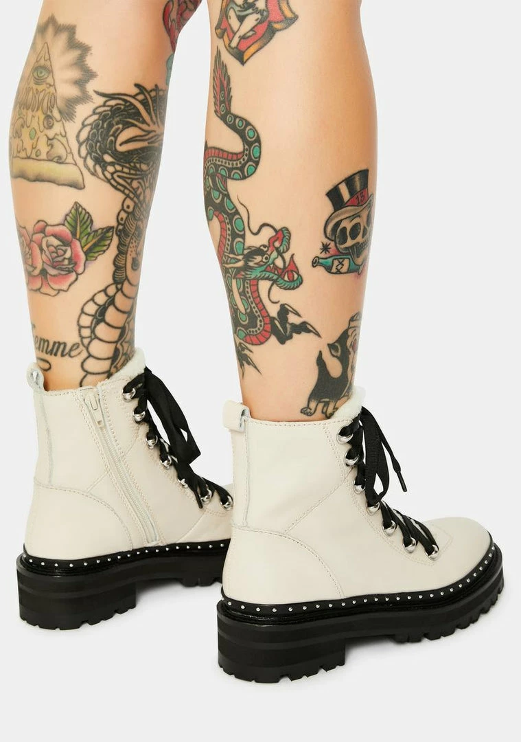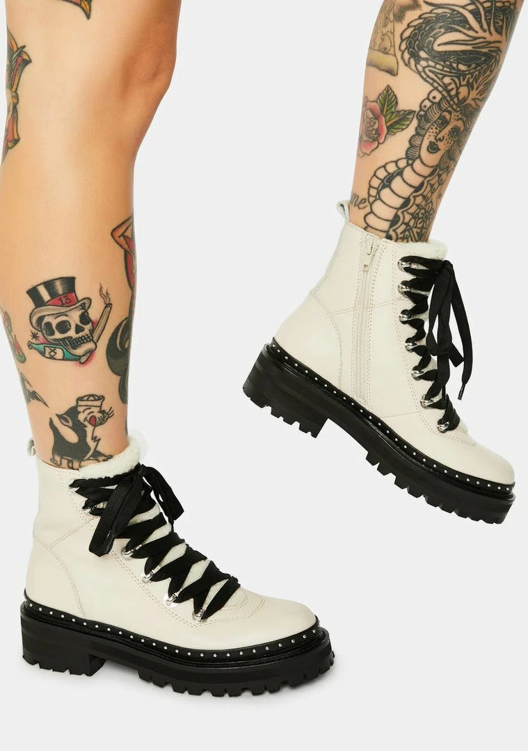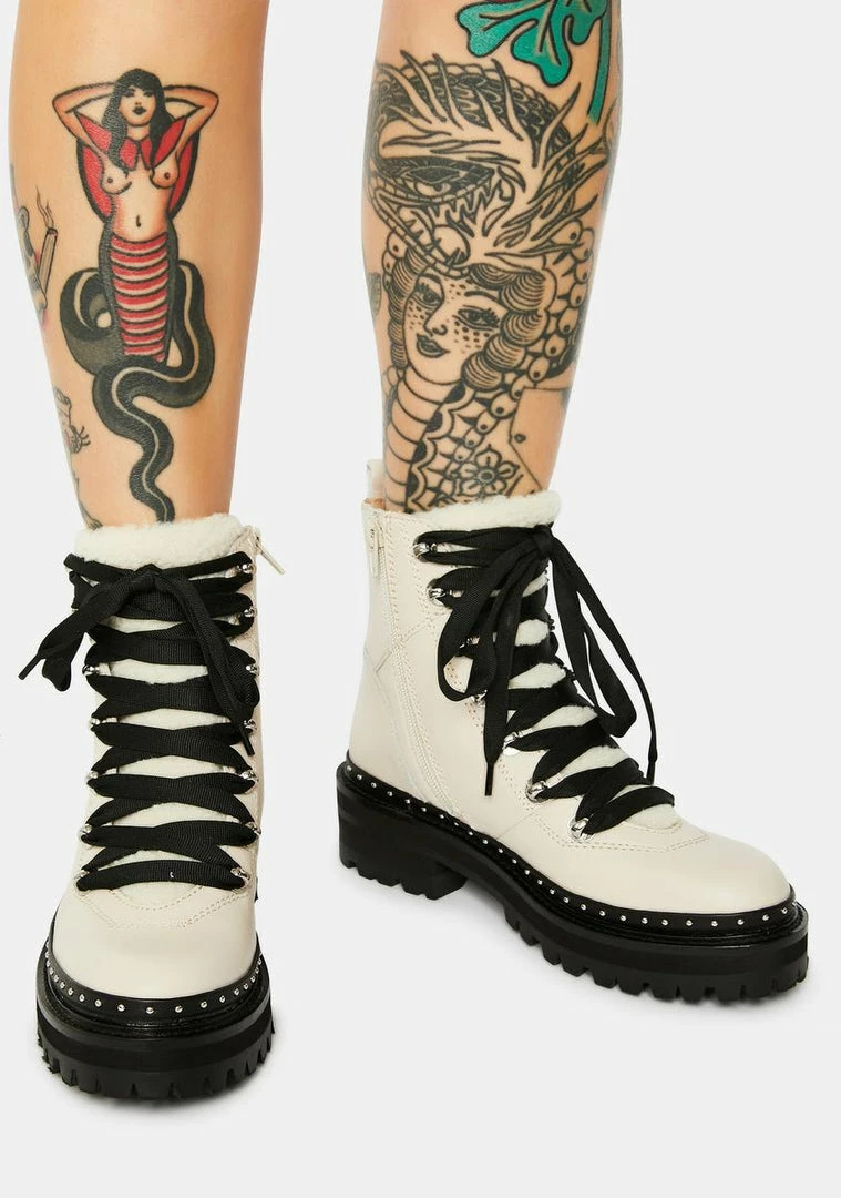 for taking the road less traveled. These moto ankle boots have lug soles with stud detailing, lace up fronts with faux shearling tongues, and side zip closures.