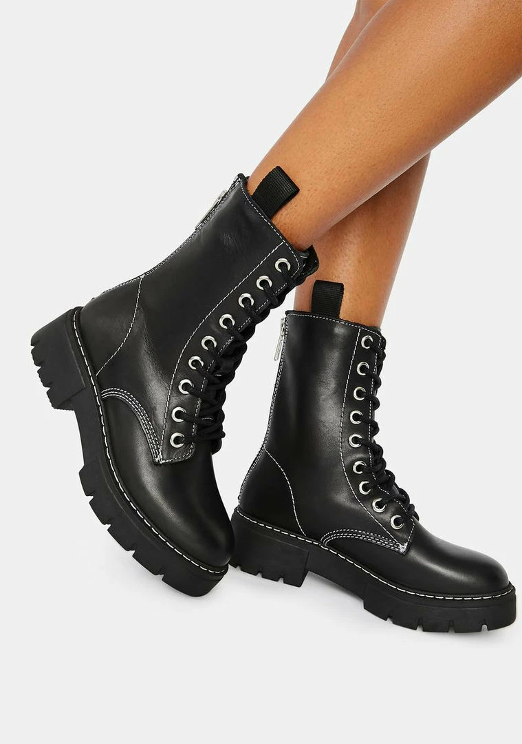 cuz youΓ’ΒΒre a worldwide baddie. These leather combat boots have adjustable lace-ups, back zip closures, contrast white stitching and side pull tabs.