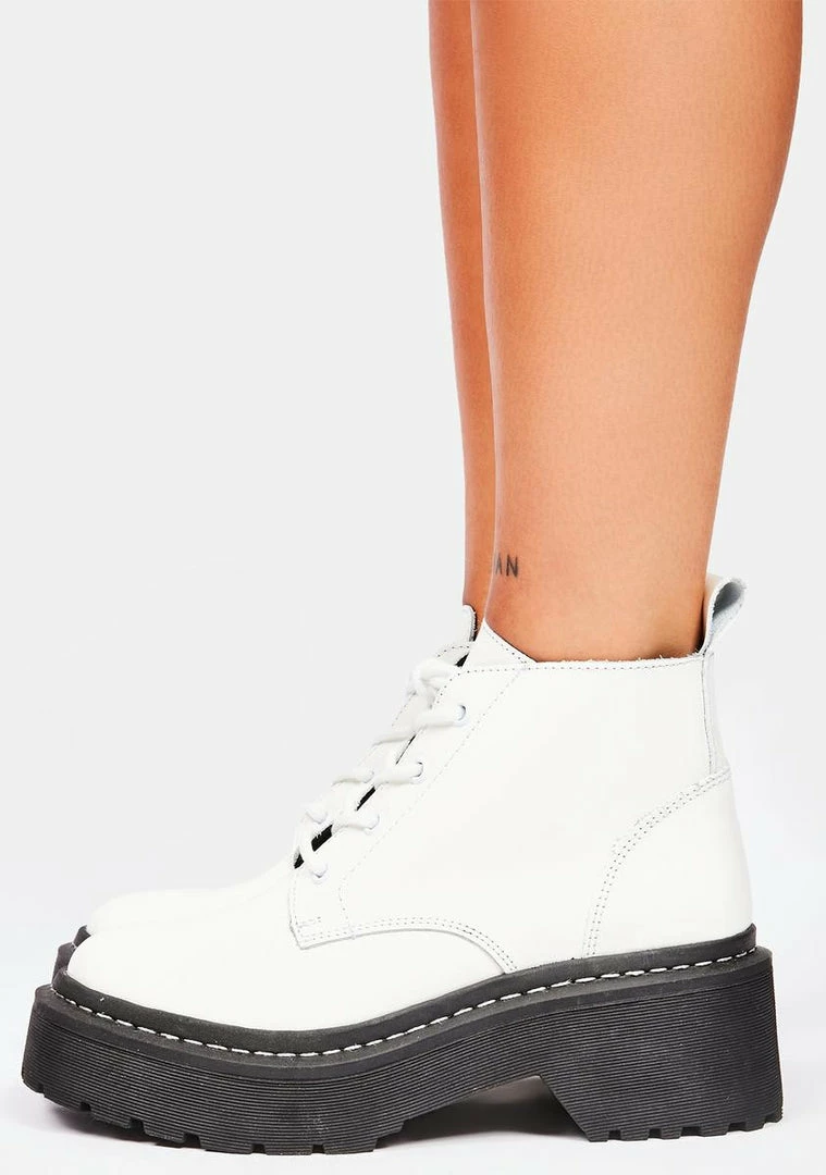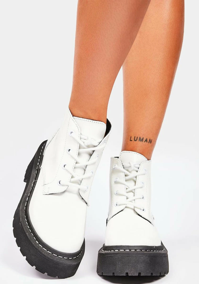 has a slightly platform treaded sole and heel, a low rise ankle design, a patent vegan leather construction, and a lace up closure.