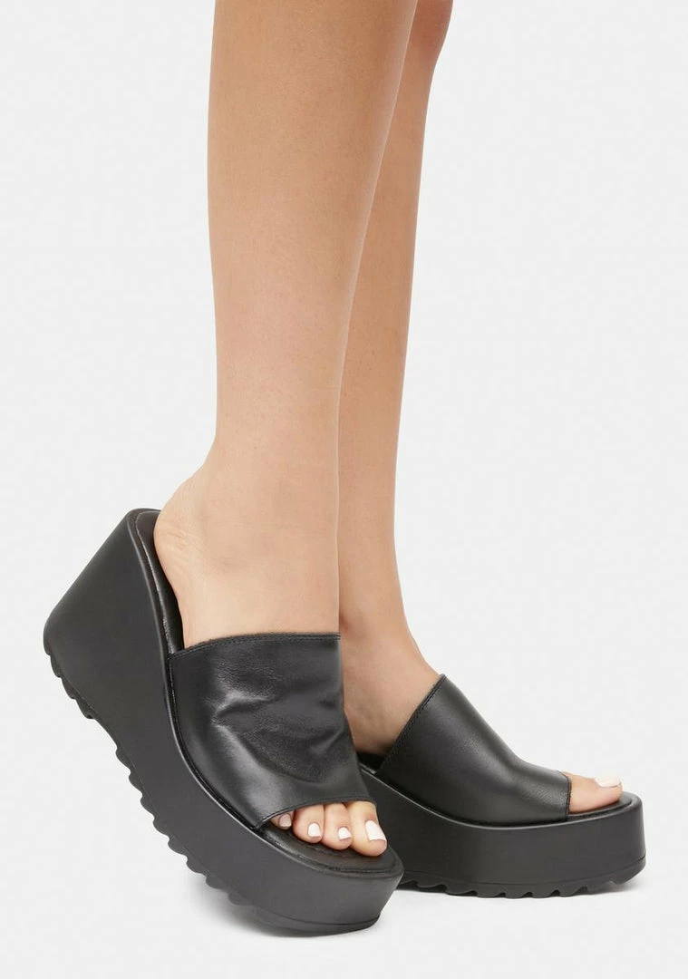 feature a treaded platform sole and a wide leather peep toe upper band.