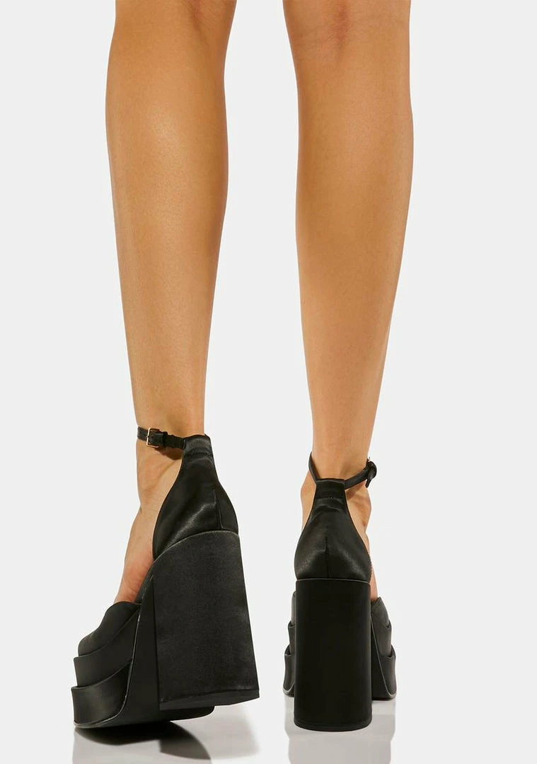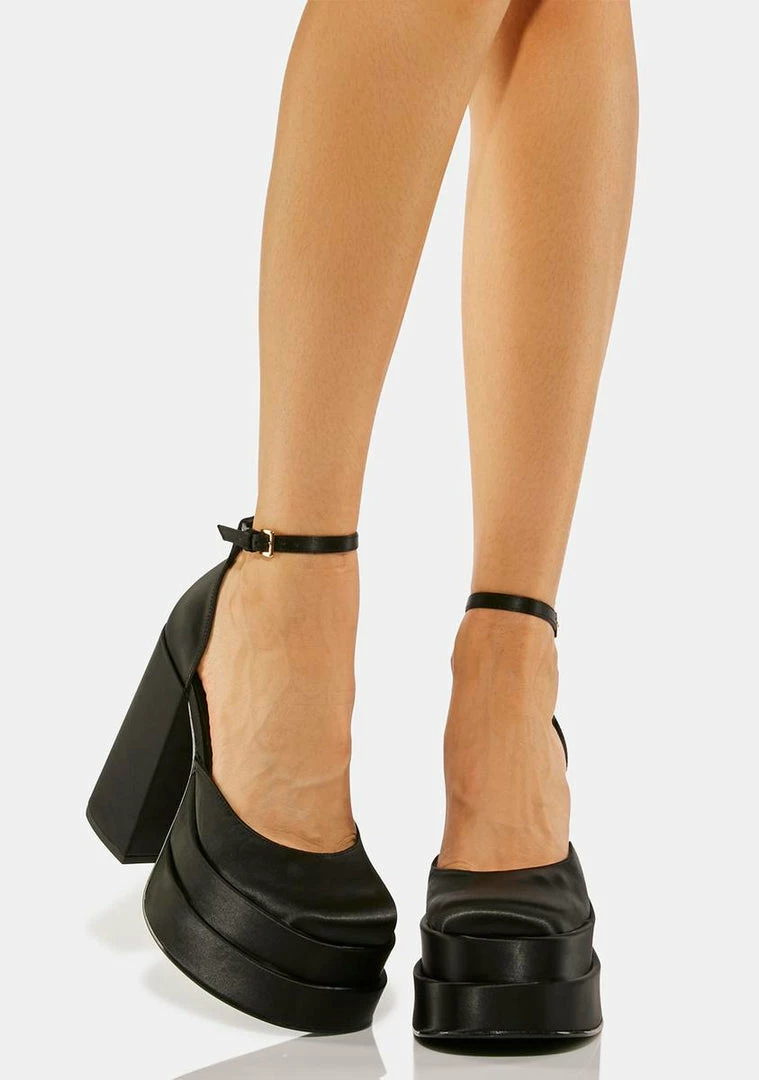 you know how to make an entrance! These heels have a satin construction, adjustable buckle ankle straps, rounded toes, stacked platforms, and block heels.
