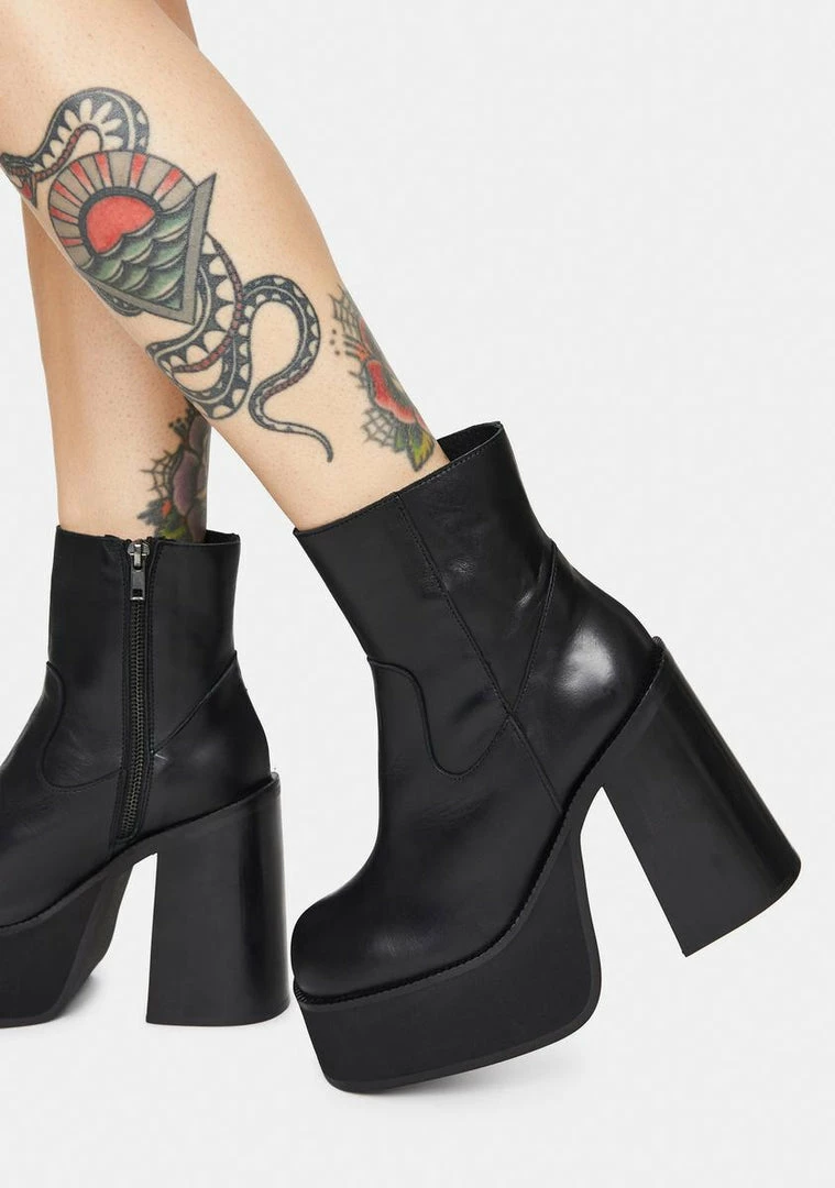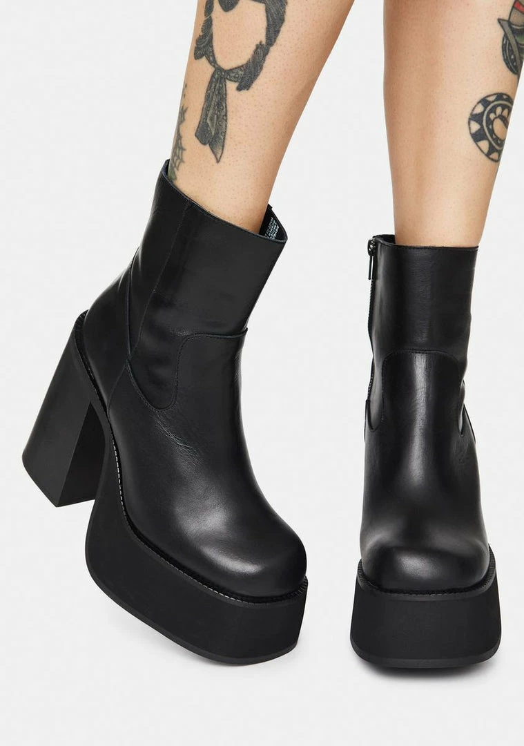 have a smooth leather construction, thick platforms, chunky block heels, rounded toes, and side zip closures.