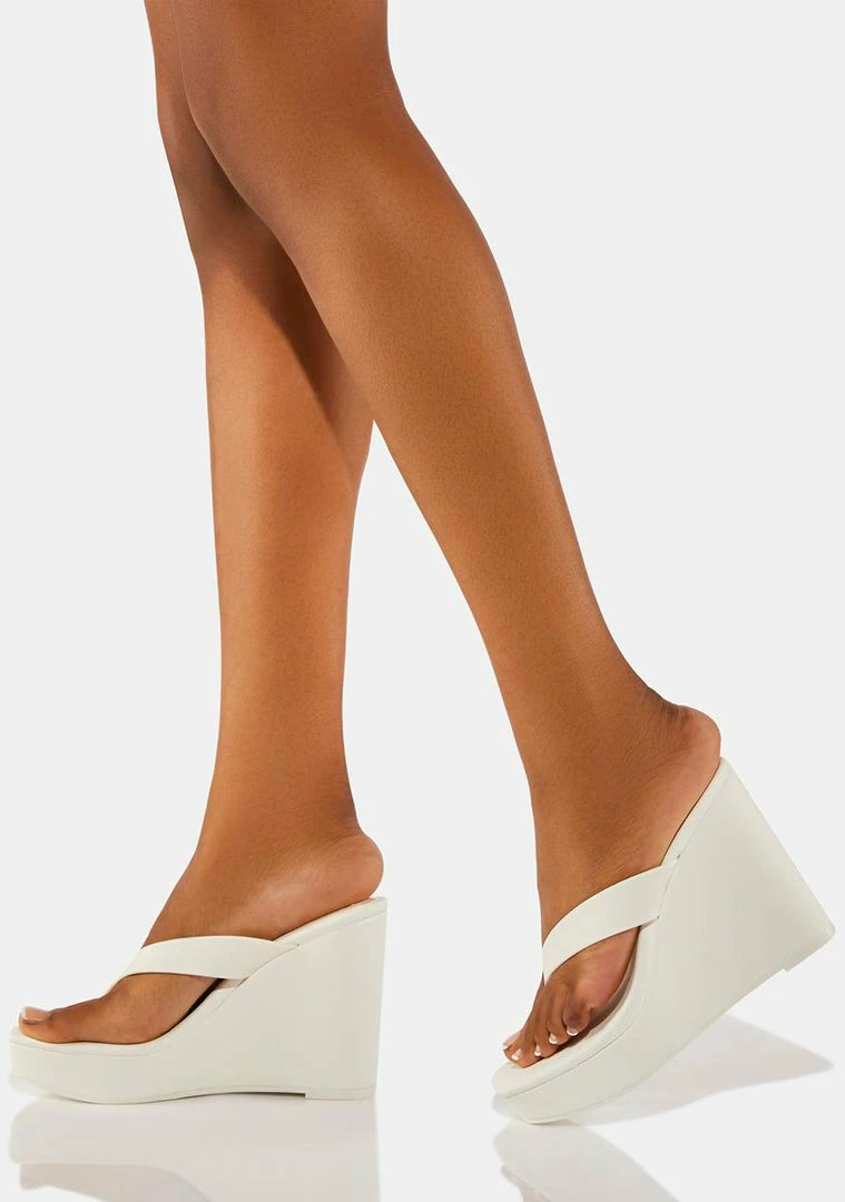 have a vegan leather construction, a square toe design, chunky platform soles, and thong straps.