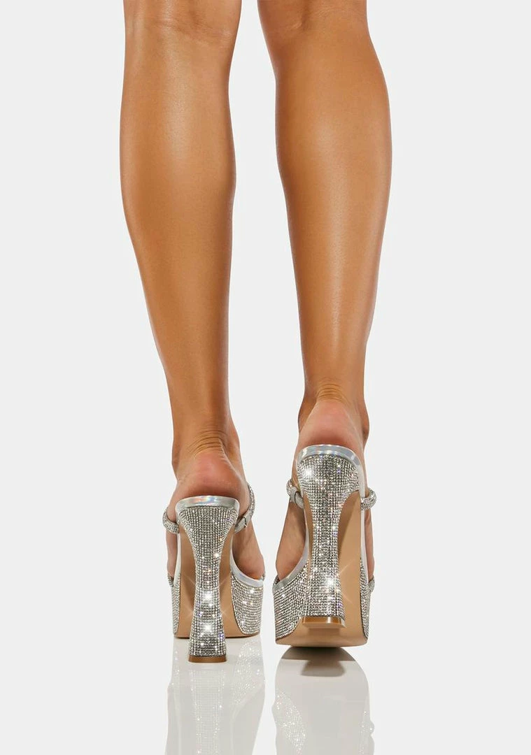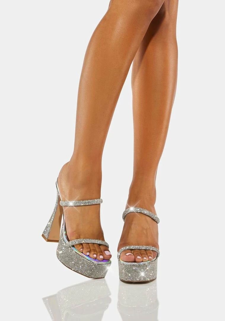 every step you take, I’ll be watching you! These heels have a rhinestone studded design, strappy uppers, square toes, and platform soles.